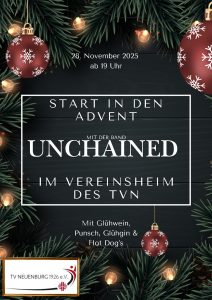 Am 28.11.2025 heißen wir euch ab 19 Uhr ganz herzlich im Vereinsheim des TVN (Rheinwaldstraße 1 in Neuenburg) willkommen, um mit euch und den jungen Musikern der Band „Unchained“ mit Glühgin, Punsch, Waffeln, Hot Dogs (natürlich auch vegetarisch) feiernd in den Advent zu starten. Der Eintritt ist frei! die Band freut sich über eine freiwillige…